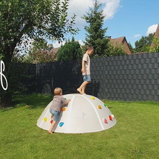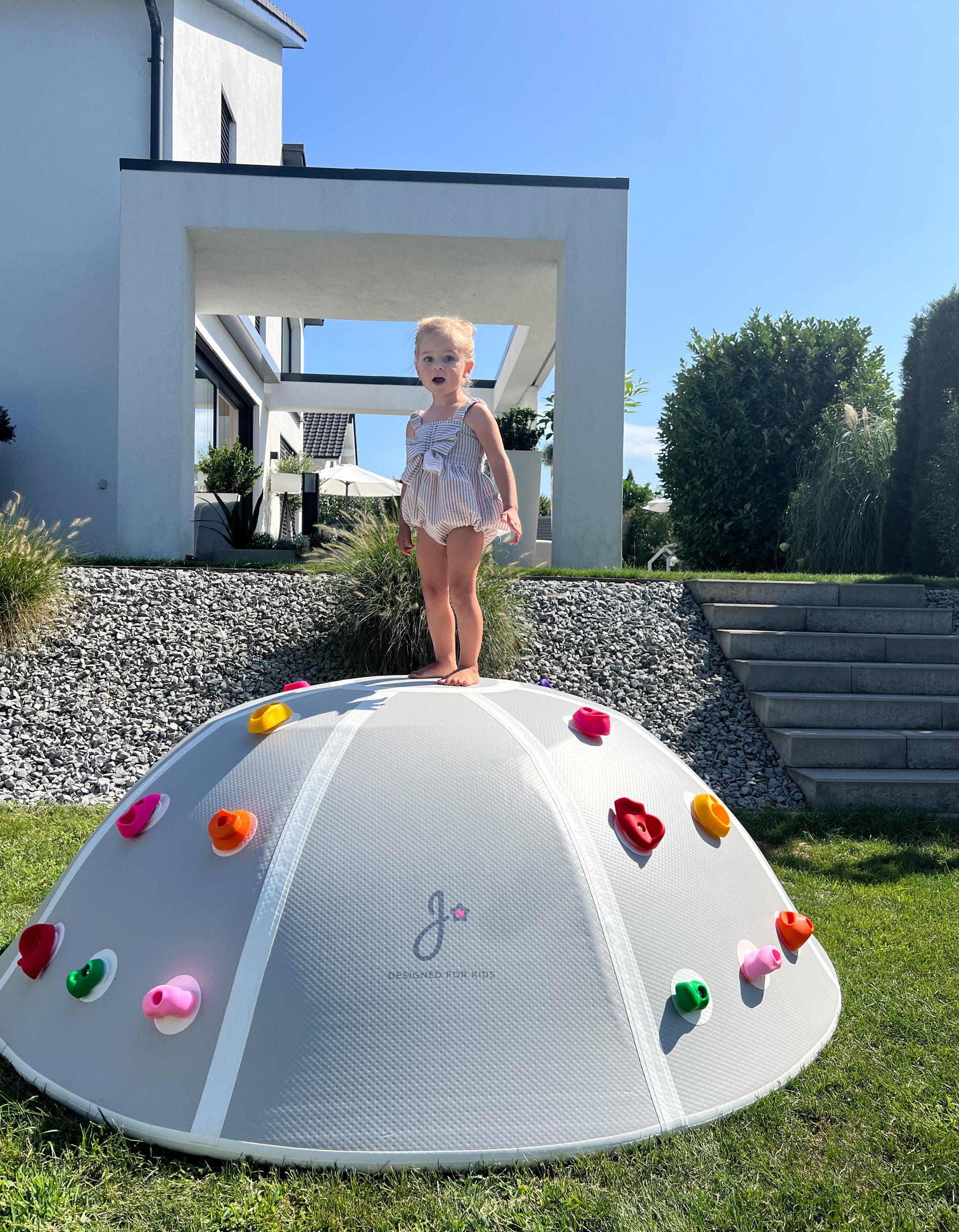 Mit dem Climb & Jump Dome von Jupiduu erlebst du echten Outdoor-Spielspaß auf einer neuen Ebene: Klettern, Hüpfen, Springen, Rutschen – dieses Spielgerät bringt Bewegung, Balance und Freude direkt in den Garten!