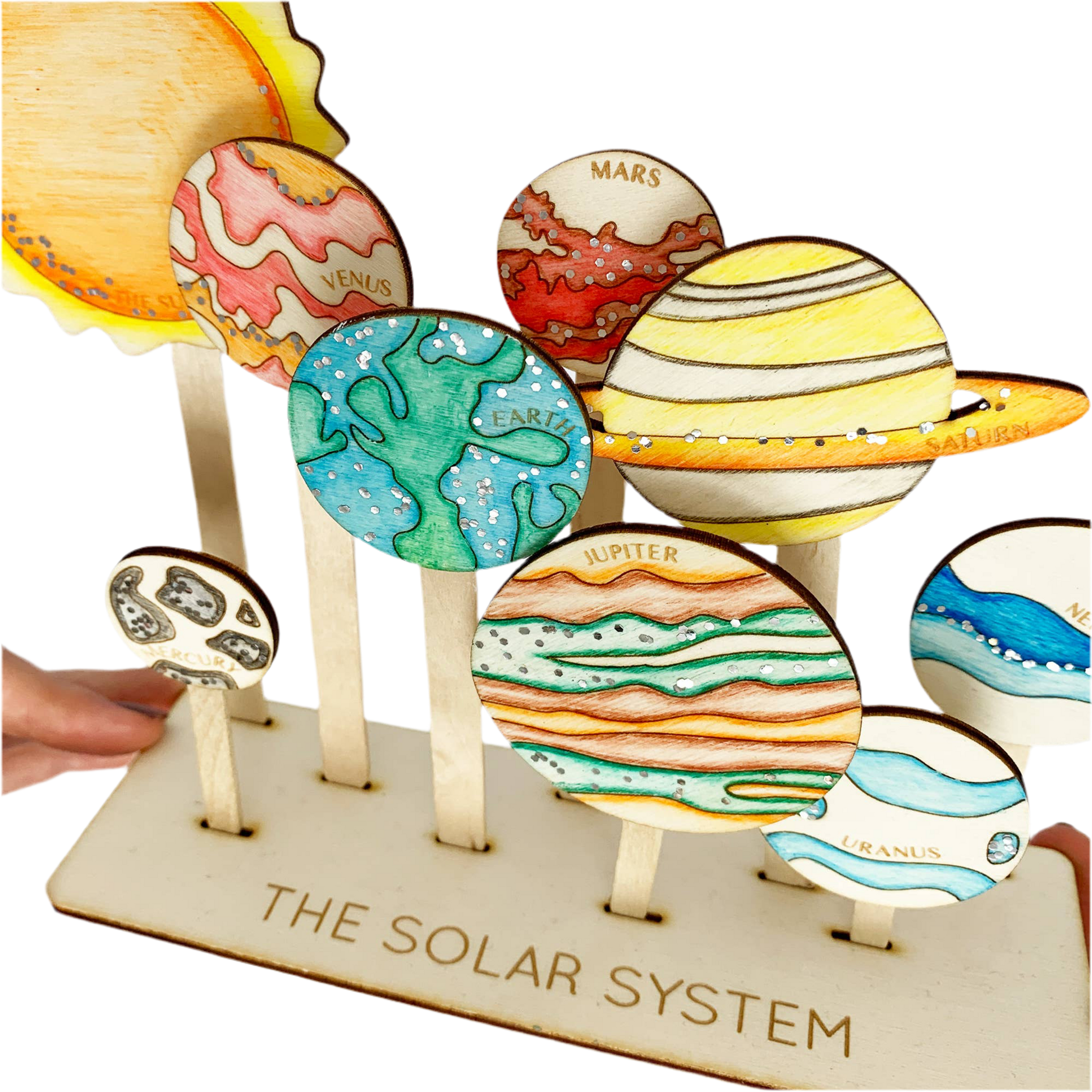 Kinder bemalen die gravierten Holzformen der Planeten mit den Aquarellstiften, verzieren sie mit ökologischem Glitzer für einen funkelnden Effekt und befestigen die Planeten mit den Lolly-Stäbchen am mitgelieferten Sonnensystem-Ständer. So entsteht ein beeindruckendes, individuell gestaltetes Sonnensystem zum Ausstellen oder Spielen.