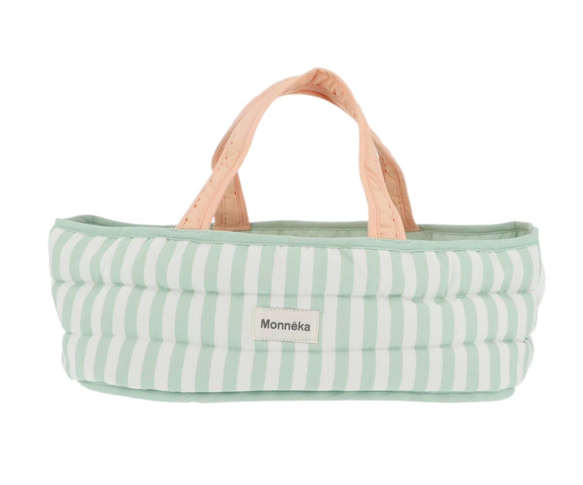 Mit der Stripes-Tragetasche von Monnëka kann Dein Kind seine Lieblingspuppen überallhin mitnehmen! Die praktische Tragetasche aus 100% Baumwolle ist ideal für Puppen bis zu 30 cm und wird mit einem kuscheligen Kissen und einer Decke geliefert, sodass die Puppen bequem eingewickelt transportiert werden können.