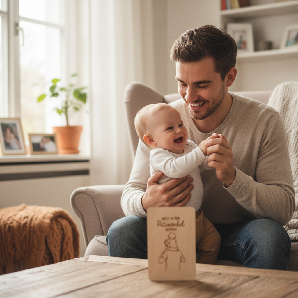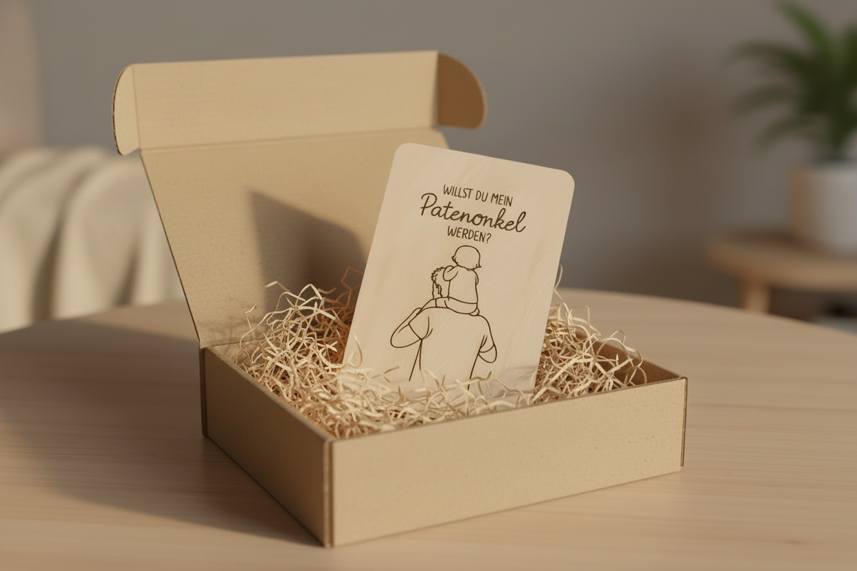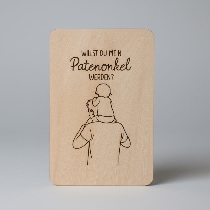 Unsere handgefertigte Holzkarte „Willst du mein Patenonkel werden?“ ist eine liebevolle Art, diesen wichtigen Schritt zu teilen – ganz ohne große Worte, dafür mit viel Gefühl.